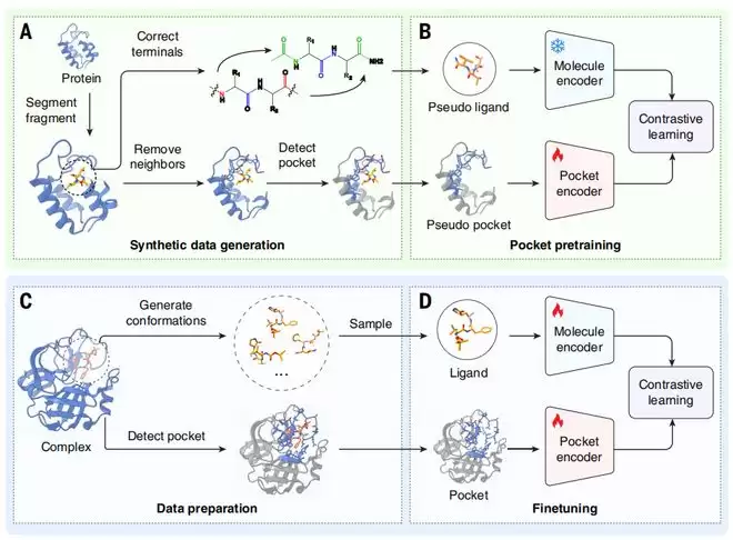 为了让 AI 在没有足够真实数据的情况下也能学好,他们想出了这样一个方法:使用蛋白质自己假装药物来训练。他们从已知的蛋白质结构数据库中,截取一小段氨基酸链比如 3-8 个氨基酸,把它当做伪配体,而它周围的区域则被当做伪口袋。