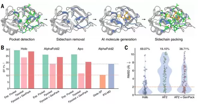这一研究首次完成了覆盖人类基因组规模的药物虚拟筛选,首次打通了从蛋白结构预测到药物发现的关键通道,可覆盖约 1 万个蛋白靶点、2 万个蛋白口袋,分析筛选了超过 5 亿个类药小分子,借此构建了已知最大规模的蛋白-配体筛选数据库,目前该数据库已免费面向全球科研社区开放 [1]。