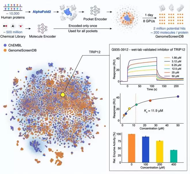 TRIP12,是一个与癌症和神经退行性疾病相关的蛋白质,此前既没有它与小分子结合的实验结构,也几乎没有已知的抑制剂报道。为此,研究人员只能使用谷歌 DeepMind 旗下的 AlphaFold2 所预测的蛋白质结构。