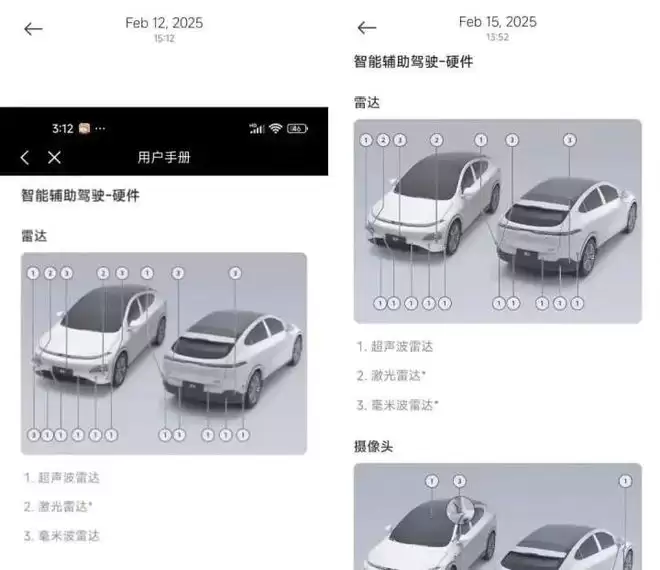 更让邓女士感到不满的是,她投诉后不久,小鹏App电子用户手册中关于该车型的配置内容被悄然修改,毫米波雷达数量从5颗变成了3颗。