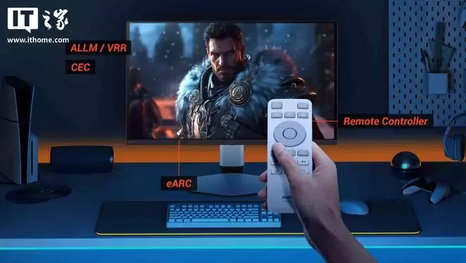 此外,显示器还配备了HDMI、DisplayPort 1.4和USB-C视频输入接口。USB-C接口支持一线通功能,能为笔记本电脑提供最高90W的反向供电。显示器支持可变刷新率与eARC音频回传,并且附带一个遥控器,方便用户随时操控OSD菜单。