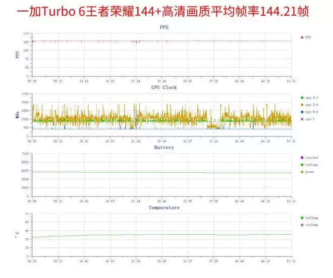 在《王者荣耀》里,一加Turbo 6现在已经适配了144帧模式,能开144帧+高清画质。和同价位120帧的画面比,不管是连续打排位的流畅度,还是激烈团战需要的连贯操控,都更流畅。我们测了1小时游戏,进峡谷后帧率稳稳锁在144fps,几乎是一条直线,就算到了后期十人团战,也能一直稳帧不掉帧。