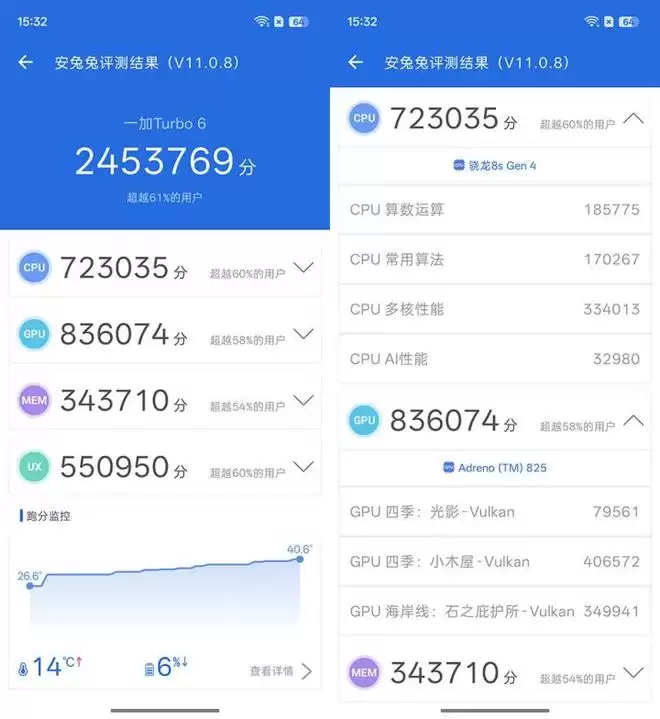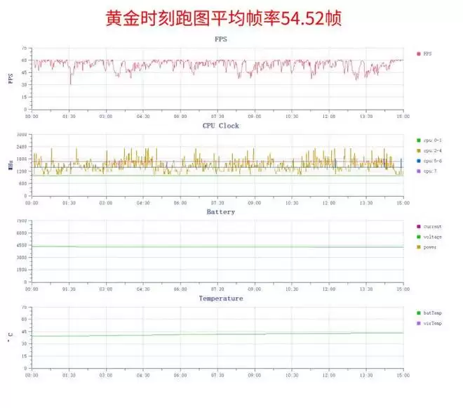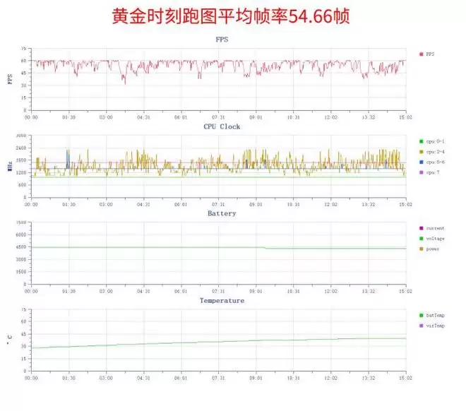 最后再看看高负载游戏的表现。在《崩坏:星穹铁道》的黄金时刻场景,我们开最高分辨率,让手机连续跑图15分钟,平均帧率54.66帧,帧率有波动但在正常范围里。和同价位手机比,一加Turbo 6的优势就是能开满画质,还能比较流畅地跑下来。发热控制得也不错,正面最高41.8度,背面最高42.2度。