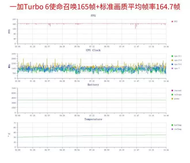 在《使命召唤手游》里,我们开165帧+标准画质测多人模式,连开了三局。因为排队和加载的时候帧率会锁在30fps,所以只统计实际进战场后的帧率。一加Turbo 6能稳稳跑到165fps的满帧,全程流畅度很稳,偶尔帧率波动也在120帧以上,完全没有卡顿感。也就是说全程都能享受到更连贯的游戏画面,帮你更快找到对手。三局打完后,手机一点都不烫手,最高温度没超过40度。