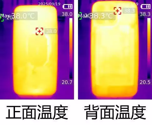 1小时游戏结束后测温,正面最高38度,背面最高38.3度,手感就是温热的,握着手很舒服。很明显,能在王者荣耀里流畅稳跑144帧还不热,一加Turbo 6这体验在同价位里确实是降维打击。