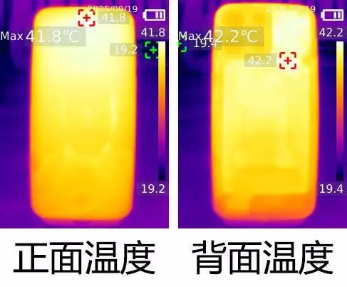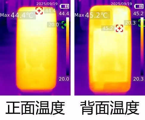 之后我们再按同样的流程跑了一遍图,平均帧率54.52帧,和上次测试差不多,但这是累计了两次测试的发热后跑出来的,所以稳定性是合格的。这次正面最高温44.4度,背面最高温45.2度。
