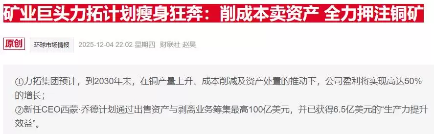 上月,力拓集团预计,在新任CEO西蒙·乔德(Simon Trott)的带领下,到2030年末,公司盈利将在铜产量上升、成本削减及资产处置的推动下实现高达50%的增长。