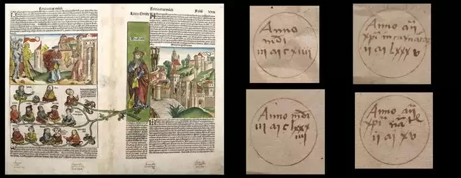 在《纽伦堡编年史》页面边角,也留着一个500多年来困扰学界的“未解之谜”:上面有四个手写的神秘圆圈,里面是几行字迹残损模糊、夹杂着大量中世纪拉丁文缩写的注释。学者仅能辨识其中“Anno”等个别字符,至于这些标记和符号到底是什么意思,一直没有答案。