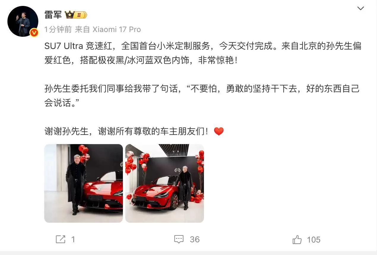 在交付仪式现场,小米创始人雷军分享了一个温暖的小插曲:孙先生通过同事转达了一句鼓励的话语——“别怕,勇敢地坚持干下去,好的东西自己会说话。”这段温馨的互动不仅体现了用户对小米品牌的支持与信任,也恰恰印证了定制化服务在满足个性化需求方面的独特价值。