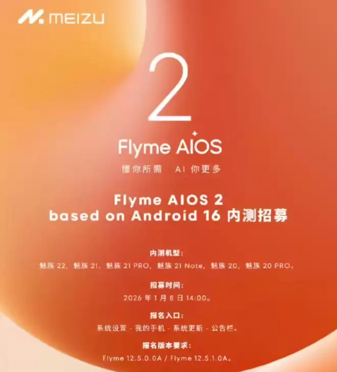 2026 年的第一个重磅惊喜比预想中来得更早一些,因为魅族近期正式开启了Flyme AIOS 2(基于 Android 16)的内测招募。