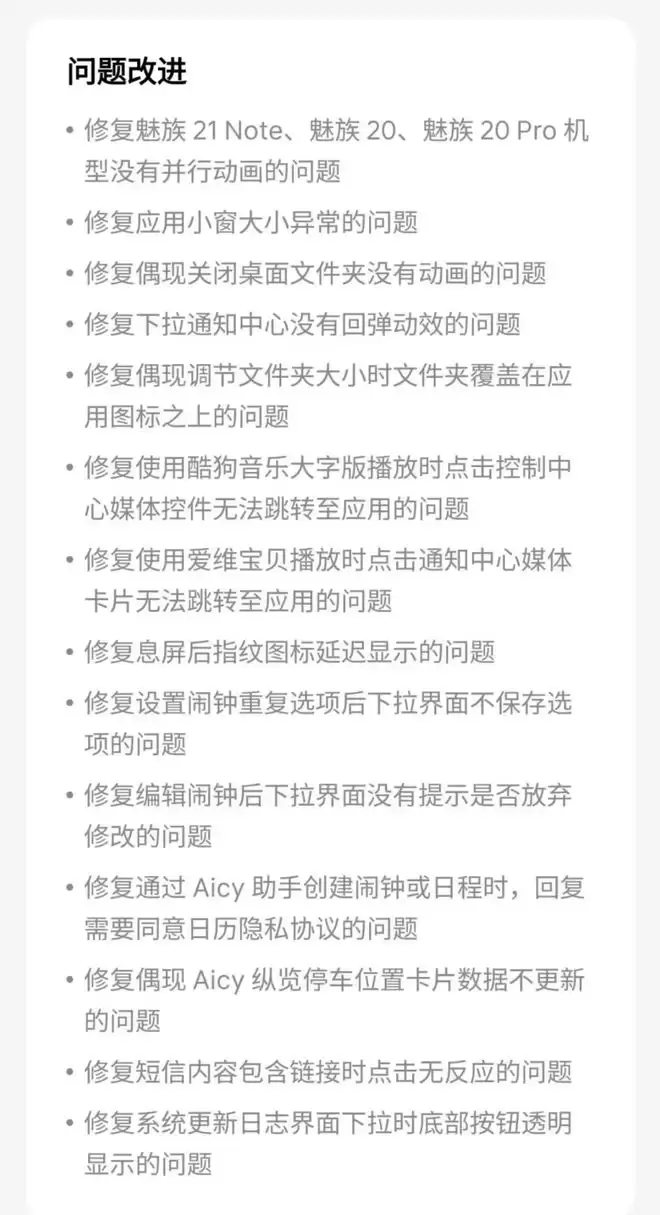 还有就是此次的更新修复了不少的问题,比如魅族21 Note/20/20 PRO无并行动画、桌面文件夹关闭无动画、通知中心下拉无回弹动效。