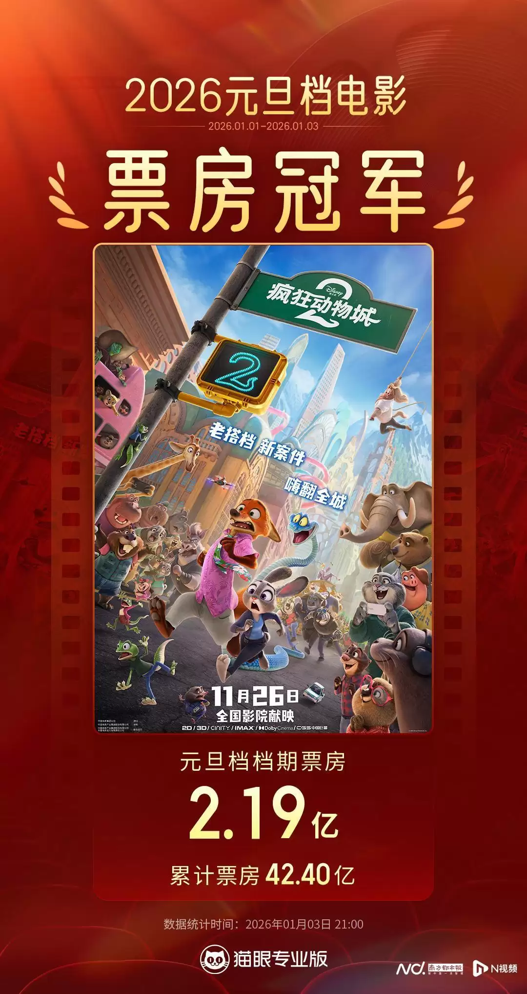根据猫眼专业版的数据统计,截至1月3日21时,2026年元旦档期总票房累计达7.34亿元。其中,《疯狂动物城2》毫无悬念地成为档期票房冠军。整个元旦档期内,共有四部影片票房突破亿元大关,它们分别是《疯狂动物城2》、《阿凡达3》、《刺杀》和《寻秦记》。尤为值得一提的是《疯狂动物城2》,它以超过2亿元的档期内票房一路领跑,其最终总票房目前已突破42亿元大关。