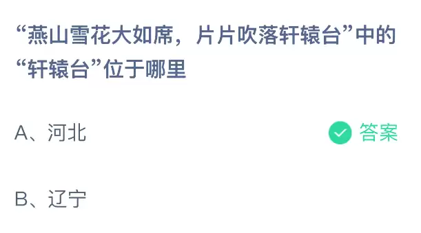 “燕山雪花大如席,片片吹落轩辕台”,诗中所写的轩辕台究竟在什么地方?跟着支付宝小鸡课堂一起来答题吧!每天花一分钟参与答题赚取饲料,喂养小鸡就能贡献一份爱心,既轻松又充满意义!2026年1月10日蚂蚁庄园的问题正确答案是【河北】,轩辕台位于河北省涿鹿县桥山主峰南侧的四岩石台。