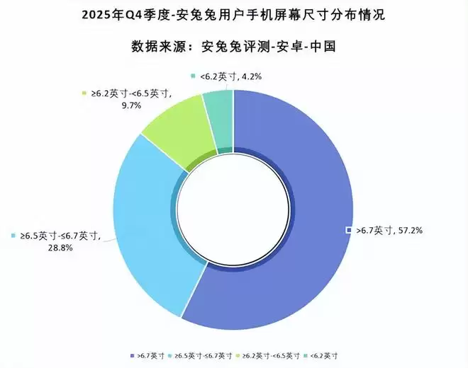 就在不久前,安兔兔于1月9日发布了一份关于手机屏幕尺寸的数据报告,内容聚焦于2025年第四季度安兔兔用户手机屏幕尺寸的分布情况。数据显示,屏幕大于6.7英寸的用户群体最为庞大,占比高达57.2%;排名第二的是屏幕大于6.5英寸且小于6.7英寸的机型,占比为28.8%;位列第三的则是屏幕大于6.2英寸小于6.5英寸的机型,占比为9.7%。有意思的是,屏幕小于6.2英寸的机型依然占据了4.2%的份额。从这组数据不难看出一个结论:当前安卓用户最偏爱的仍然是大屏手机,整体占比过半;其次受欢迎的是中屏手机。若将两者数据相加,其总占比更是超过了86%。