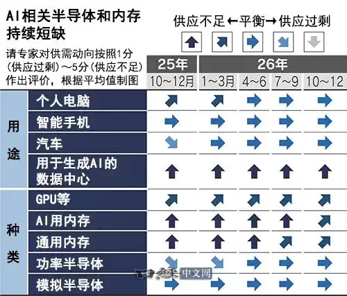 日本经济新闻对2026年半导体供需情况邀请了专家进行评估。专家们普遍认为,供应将出现不足的主要是AI用半导体。受此波及,用于智能手机和个人电脑的通用存储设备也出现短缺……