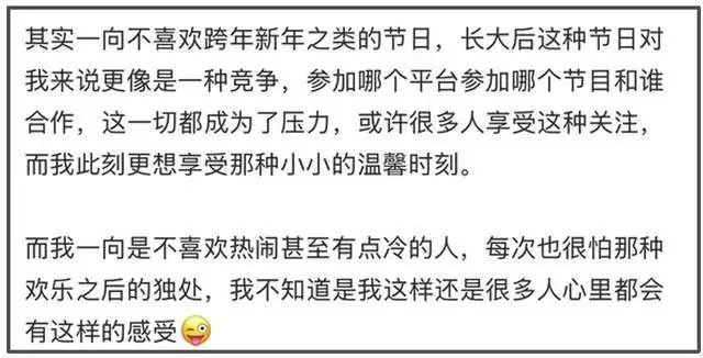 还说自己事事都想做好,抱怨在娱乐圈太忙了,把所有的压力给了自己。不喜欢跨年新年的节日,因为要参加节目还要想和谁合作,这一切都是压力。