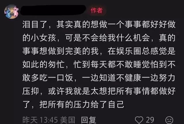 她本人回复粉丝的时候,也承认当年有明星光环,日子过得很好,没有了之后,就“很让人不那么滋润”。说自己成为了照顾家里的主力队员,而不是把精力全投入自己。