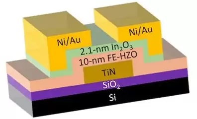 除了逻辑型BEOL器件,研究团队还通过集成铪锆氧化物(HZO)铁电层,开发出兼具存储功能的BEOL晶体管。选择铪基铁电材料是基于实际应用考量——铪氧化物基铁电材料已在CMOS兼容存储与计算领域展现出巨大潜力。据报道,该类器件的尺寸达到20纳米级别,开关速度可达10纳秒(已接近测试设备的测量极限),且工作电压低于同类型传统器件。
