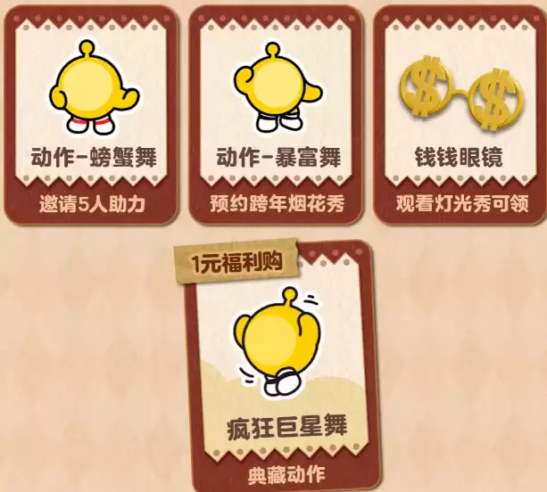本次元旦版本同步上线多款限定外观与动作道具:- 螃蟹舞:完成5人助力任务即可免费解锁;- 暴富舞:成功预约跨年烟花秀后自动发放;- 钱钱眼镜:观看指定灯光秀内容后直接领取;- 疯狂巨星舞:需通过游戏内商城以1元价格获得。
