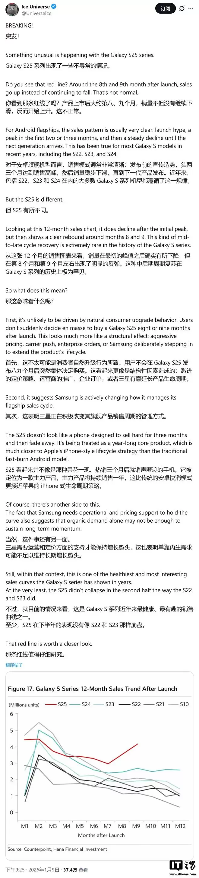 1月10日,据知名科技资讯博主@UniverseIce在社交平台X透露,市场研究机构CounterPoint的数据显示,三星Galaxy S25系列在发布后的第八至九个月,销量不仅未现疲态,反而迎来了罕见的“第二春”。截至目前,该系列全球累计出货量已成功突破3000万台大关。