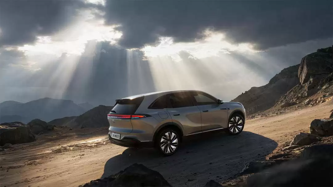 至境E7的命名蕴含深意:“E”取自品牌英文名Electra、进阶Evolution及用户核心Everyone,象征着以长期主义为家庭用户提供可持续的出行保障;“7”则代表品牌对五座SUV市场的精准洞察,谐音“一起”更传递出与用户共赴美好生活的愿景。车身尺寸达4850mm×1910mm×1676mm,轴距2850mm,通过修长的比例与饱满的体积,营造出大气优雅的视觉效果。设计灵感源自至境SUV概念车,飞翼式腰线如海浪涌动,搭配分体式灯组与星河展翼大灯,勾勒出兼具科技感与辨识度的前脸造型。贯穿式银河展翼尾灯采用参数化阵列光源,点亮后如羽翼舒展;20英寸展翼流影轮毂与米其林轮胎的组合,则将空气动力学与美学设计完美融合。