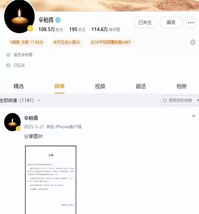 去年5月21号,一向把社交账号当摆设、除了宣传几乎不发私事的辛柏青,忍痛发布了讣告。那一刻,大家才意识到那个爱笑的“邻家大姐”这次是真的出了远门。