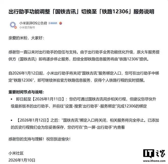 1月10日,IT之家从小米社区获悉,由于澎湃OS系统对出行助手业务进行了功能优化与升级,原本由国铁吉讯提供的火车票务服务将逐步停止,后续相关服务将由“铁路12306”官方应用全面接管。