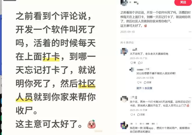网友们说,现在独居的人越来越多,孤独死是不少人心里的隐忧,这 App 的名字虽然直白,却精准戳中了社会痛点,反而能提醒大家关注独居人群的安全。