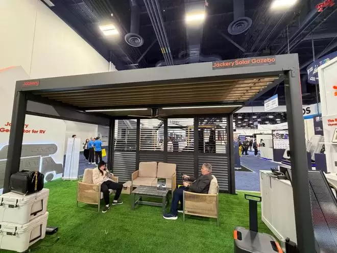 比如这款Jackery Solar Gazebo(太阳能遮阳棚),彻底打破了传统光伏产品的形态限制,堪称“可发电的户外遮阳棚”。它的结构中融入了2000W高功率光伏系统,既能抵挡风雨雪,又能为庭院照明、娱乐设备等提供电力。