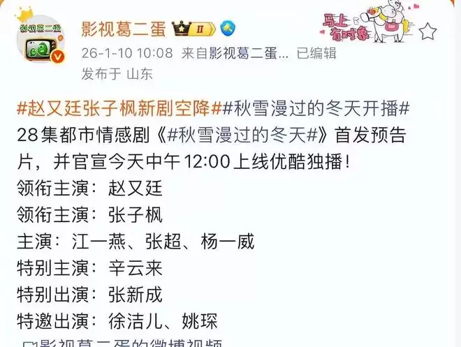 2. 2026年1月10日上午10点,《秋雪漫过的冬天》正式发布定档预告,由赵又廷与张子枫联袂主演;仅仅两个小时后,该剧便在优酷及酷喵TV平台开启全网独播模式,速度之快令人咋舌。