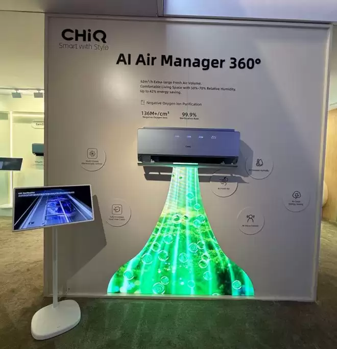 旁边的AI Air Manager 360°空调也刷新了我对空调的认知,它不只是简单的制冷制热,而是能全方位管理温度、湿度、空气洁净度和含氧量。通过高精度传感器实时感知环境变化,AI会自动联动负氧离子、新风等功能,智能调节运行模式与温湿度,营造出舒适又心旷神怡的环境。