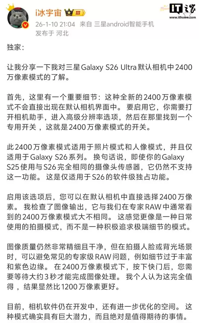 据IT之家1月10日消息,数码博主@i冰宇宙今晚分享了他对三星 Galaxy S26 Ultra 相机中新增的2400万像素模式的分析。