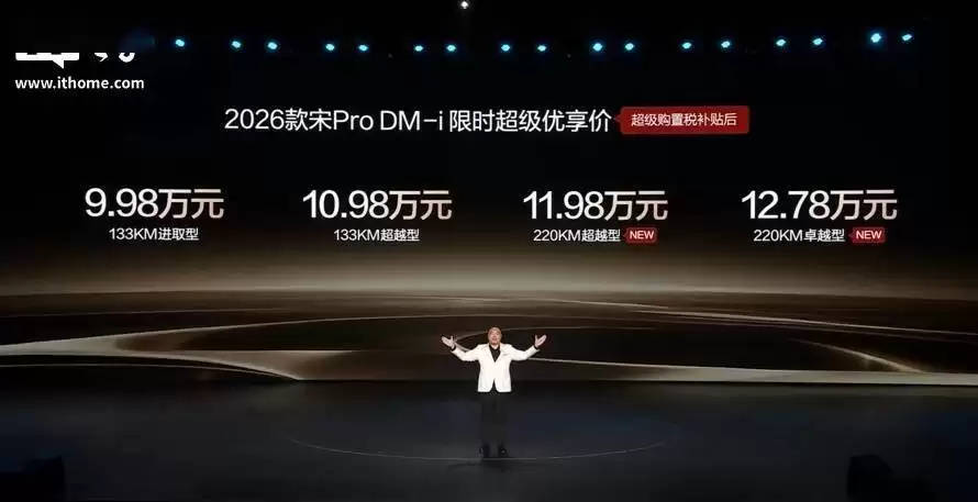 在今晚的新品发布会上,比亚迪正式推出了2026款宋Pro DM-i长续航版车型。这款新车提供了两个版本:补贴后售价11.98万元的220KM超越型,以及售价12.78万元的220KM卓越型。凭借极具竞争力的价格,新车强势切入A级新能源SUV市场。