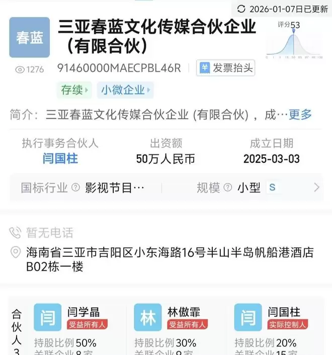 根据那位博主的爆料,阎老师账号的收入都会划到一家名为“三亚春蓝文化传媒有限公司”的企业里。这里的股权分配也挺有意思:阎学晶本人占了50%,儿子林傲霏拿了30%,弟弟阎国柱也有20%。