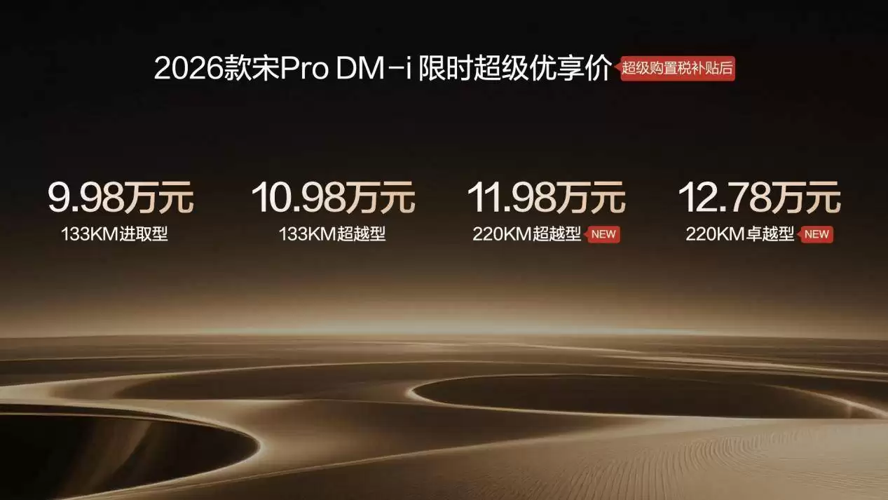 比亚迪正式推出2026款宋Pro DM-i 220km长续航版本,新车凭借220公里CLTC纯电续航和高达1600公里的满油满电综合续航能力,成为市场关注的焦点。最新数据显示,该车型在NEDC工况下百公里综合油耗仅为3.2升,全系还推出了9.98万元至12.78万元的限时优惠价,进一步巩固了其在插电混动市场的竞争力。