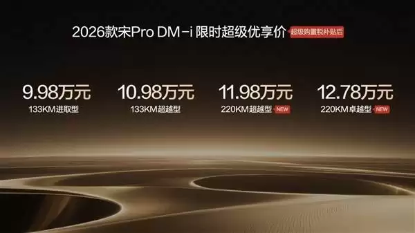 比亚迪近日为宋Pro DM-i车系新增了2026款220km长续航版本,进一步丰富了其插电混动SUV的产品矩阵。此次上市的新车提供两款配置,官方指导价区间为12.28万元至13.08万元。在享受3000元限时购置税补贴后,实际支付价格下探至11.98万至12.78万元。至此,宋Pro DM-i已形成133km与220km双纯电续航的布局,全系在售车型增加至四款,价格覆盖9.98万元至12.78万元区间。