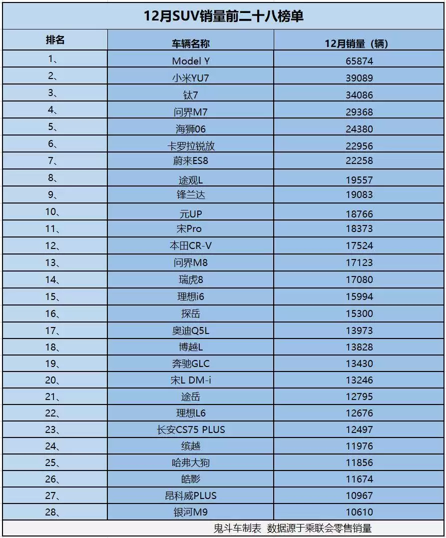 2025年12月SUV销量榜:28款破万,米钛7等新能源车型崛起