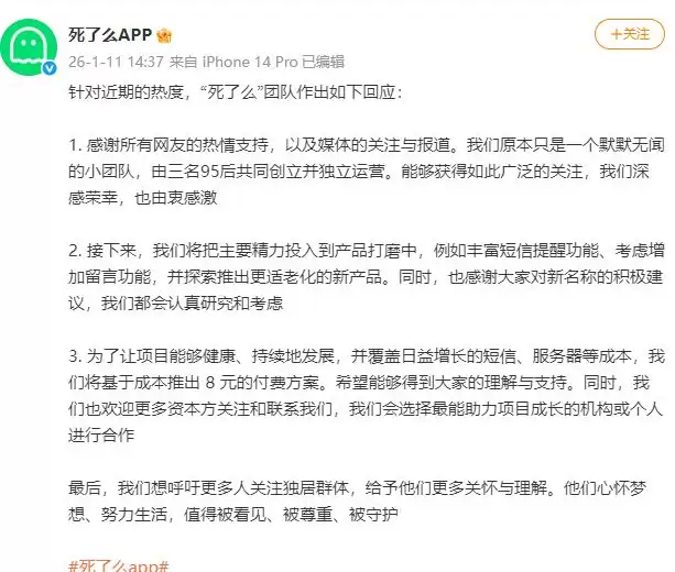 3. 为了让项目能够健康、持续地发展,并覆盖日益增长的短信、服务器等成本,我们将基于成本推出 8 元的付费方案。希望能够得到大家的理解与支持。同时,我们也欢迎更多资本方关注和联系我们,我们会选择最能助力项目成长的机构或个人进行合作。