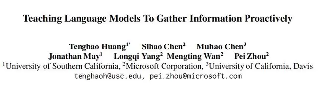相关论文以《教会语言模型主动收集信息》(Teaching Language Models To Gather Information Proactively)为题,已经被 EMNLP-Findings 2025 接收 [1]。南加州大学博士生黄腾昊(目前在微软实习)是第一作者,微软公司资深研究科学家周沛和陈斯昊担任共同通讯作者。