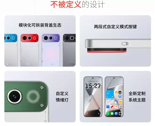 不过,魅族最新依旧公布了魅族 22 Air 的外观设计。该机采用了后置横向排列镜头模组,配备可自定义图案和状态的情绪灯;中框拥有一个两段式自定义模式按键和全新定制的系统主题,支持模块化设计;可拆卸的原生磁吸后盖设计,满足用户个性化需求。