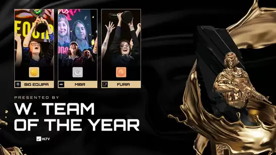 在2025年的颁奖典礼上,HLTV公布了年度最佳女子战队的获奖队伍与排名,BIG EQUIPA荣获此项荣誉,MIBR fe位列第二,FURIA fe则排名第三。