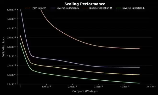 多样化采集预训练的模型比干净数据采集训练的模型具有更快的收敛速度和更好的验证误差。