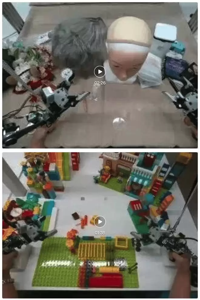 多样化采集数据示例。上:采集员通过末端执行器操作给假人模型化妆。下:采集员组装复杂的乐高结构。两个案例都展示了多样化原子技能的连续流,包括抓取、扭转、插入和复杂的双手协调。