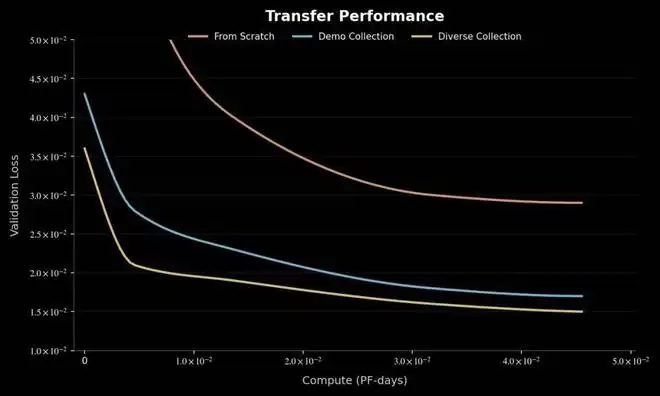验证误差的持续下降:研究还发现,随着多样化数据规模的扩大,模型在新任务上的验证误差呈持续下降趋势。这证明模型正在有效地从现实世界日益增加的内在多样性中汲取养分,形成了一种通用的策略基础。