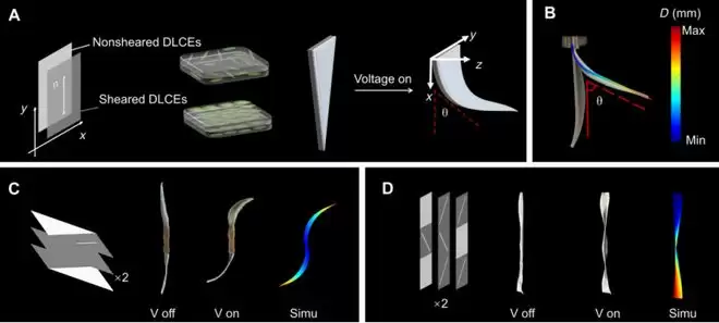 当给材料两面贴上电极并通电的时候,电场会产生一种叫做麦克斯韦应力的力来挤压材料。由于不同区域软硬不同,它们被挤压收缩的程度也不同,这种步调不一致就导致了整张材料发生弯曲、扭转等复杂的立体变形。就像我们在折纸的时候,在不同位置预先折出不同的折痕,一推就能变成千纸鹤一样,本次团队则是在微观分子层面折出了隐形的折痕。