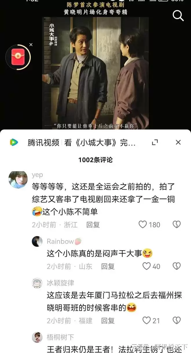 《小城大事》的演员表中,惊现陈梦!奥运冠军陈梦跨界演戏,居然拿着菜刀当乒乓球拍,把表哥黄晓明打得毫无还手之力!本来是冲着赵丽颖和黄晓明的主线剧情来追剧的,结果不少人直接被陈梦的“降维打击”圈了粉,拍摄片花评论区全是“这才是专业选手的压迫感”“山东亲戚互怼太真实了”。