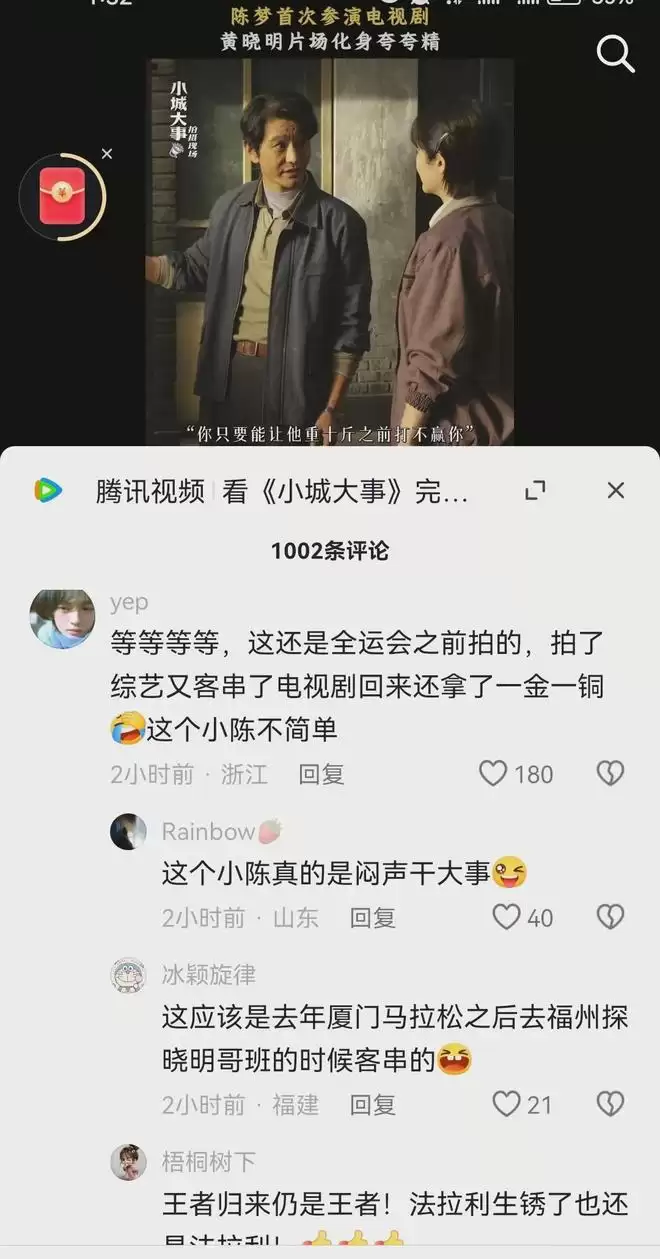 其实这俩人能有这么自然的互动,不仅靠演技,更是靠现实里的表亲关系加持。早在陈梦奥运夺冠的时候,黄晓明就激动地连发20个“啊”庆祝,还在家族群里狂发百个红包,比自己获奖还开心。