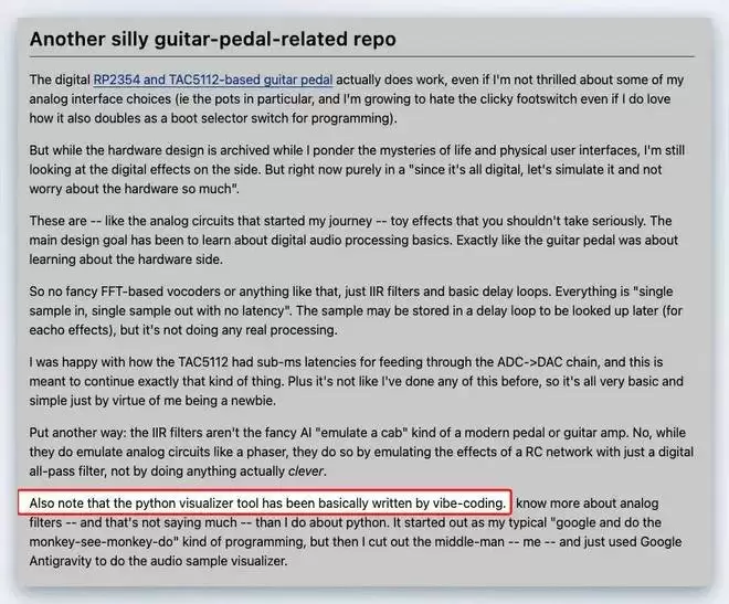 在自述文件中,Torvalds 说这是一个和吉他效果器相关的代码库,「这些效果器在利用 AI 技术『模拟箱体』…… 另外需要注意的是,这个 Python 可视化工具基本上是用 Vibe Coding 的方式编写的。」