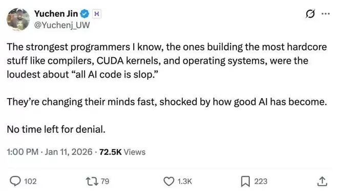 有人感叹,「我认识的最厉害程序员,包括那些构建编译器、CUDA 内核和操作系统等最核心功能的程序员,他们以前对「所有 AI 代码都是垃圾」的呼声最高。但如今,他们的想法正在迅速改变,并对 AI 的强大感到震惊。没有时间去否认这一点了。」