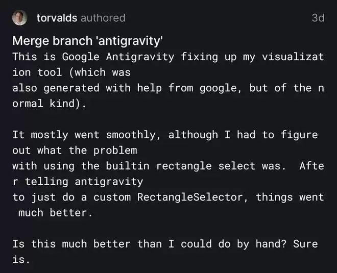 对于 AI 编程工具的加入,Torvalds 自己的心得是:过程基本顺利,虽然他有时需要琢磨一下使用「内置矩形选择」功能时到底出了什么状况。在告诉 Antigravity 直接写一个自定义的 RectangleSelector 之后,情况就好了很多。
